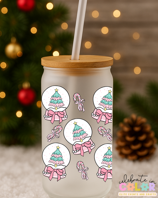 Pink Christmas Tree Snow Globe Libbey Cup, 16oz Frosted Glass with Bamboo Lid & Straw, Cute Holiday Gift for Her, Pink Christmas Drinkware