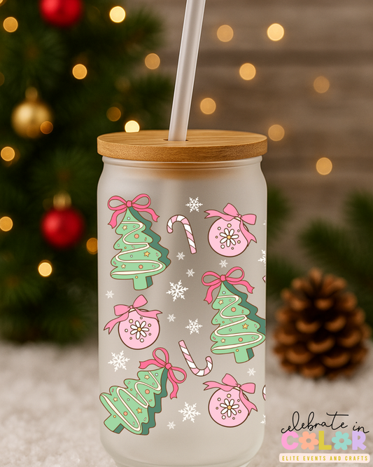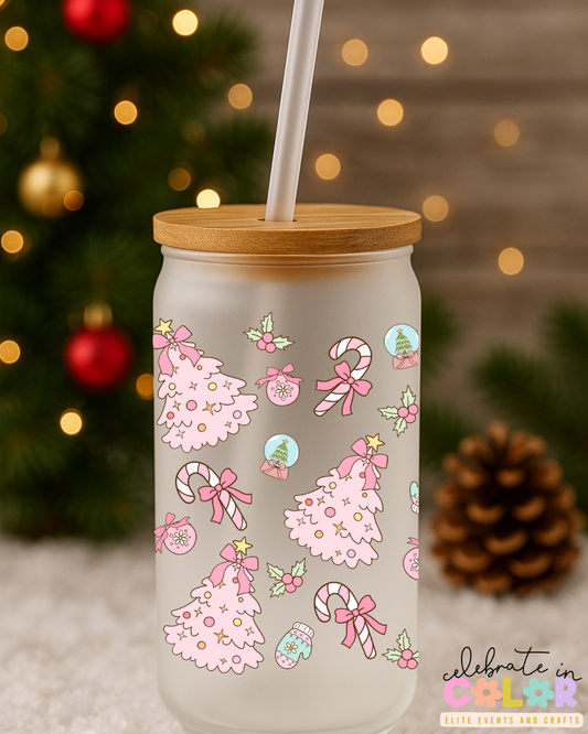Pink Christmas Tree Libbey Cup, 16oz Frosted Glass, Cute Holiday Drinkware, Candy Cane & Ornament Design, Christmas Gift for Her