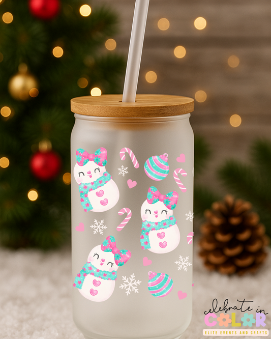 Pink Snowgirl Libbey Cup, 16oz Frosted Glass with Bamboo Lid & Straw, Cute Pastel Christmas Cup, Holiday Gift for Her, Pink Winter Mug