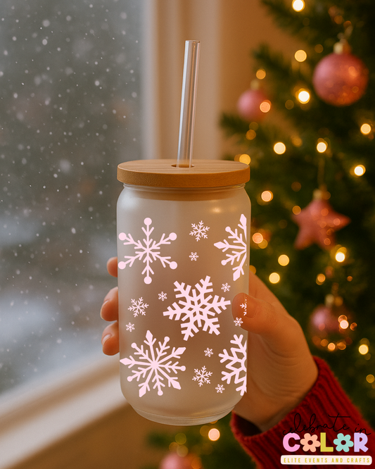 Pink Snowflake Libbey Cup, 16oz Frosted Glass with Bamboo Lid & Straw, Cute Winter Cup, Holiday Drinkware, Aesthetic Christmas Gift for Her