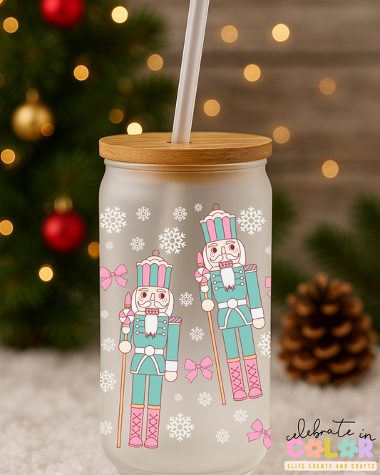 Pastel Nutcracker Libbey Cup, 16oz Frosted Glass with Bamboo Lid & Straw, Cute Christmas Cup, Holiday Gift for Her, Ballet Inspired Drinkware