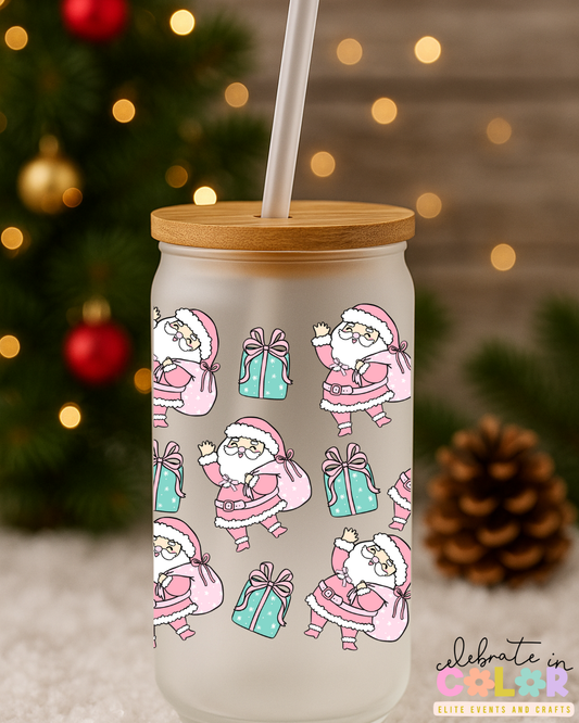 Pink Santa Frosted Glass Cup, Christmas Glass Can with Bamboo Lid & Straw, Retro Holiday Gift for Her, Cute Christmas Drinkware