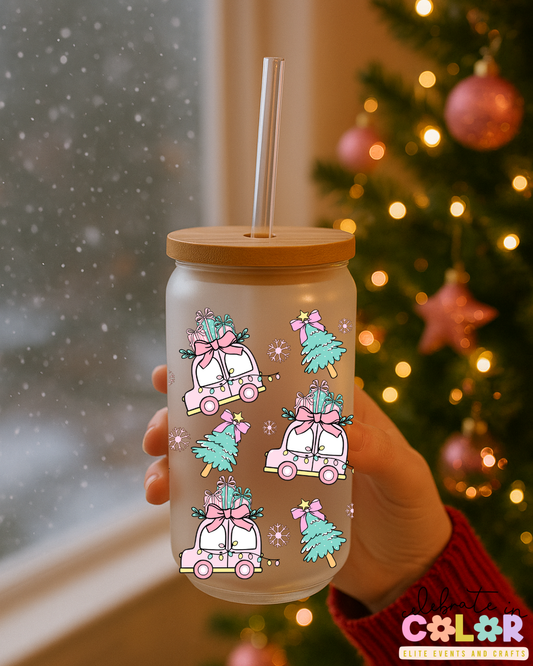 Pink Christmas Car Frosted Glass Cup, Holiday Glass Can with Bamboo Lid & Straw, Cute Pastel Christmas Drinkware Gift for Her