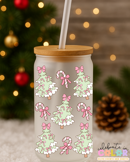 Pastel Christmas Tree Libbey Cup, 16oz Frosted Glass with Bamboo Lid & Straw, Cute Holiday Cup, Pink & Green Christmas Gift for Her