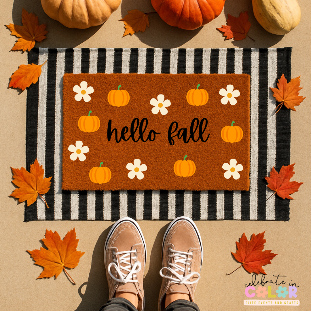 Say hello to fall with this cozy and charming doormat! Featuring sweet pumpkins and daisies with a handwritten “hello fall” greeting, it’s the perfect seasonal touch for your front porch, entryway, or back patio.