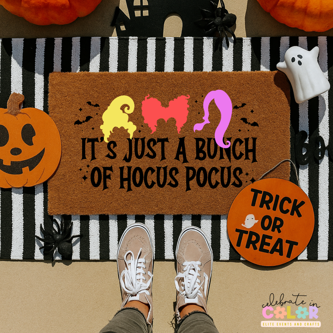 Put a spell on your guests this Halloween with this fun and festive “It’s Just a Bunch of Hocus Pocus” doormat! Featuring colorful silhouettes inspired by the iconic Sanderson Sisters, this coir mat adds a touch of magic to any doorstep.