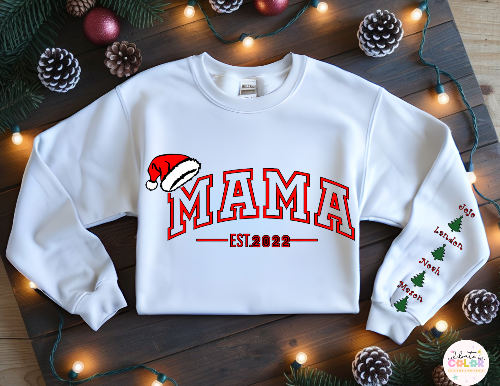 Puff Glitter Christmas Mama Sweatshirt, Personalized Family Name Crewneck, Holiday Mama Est. Sweater, Custom Family Tree Sleeve, Matching Christmas Outfit