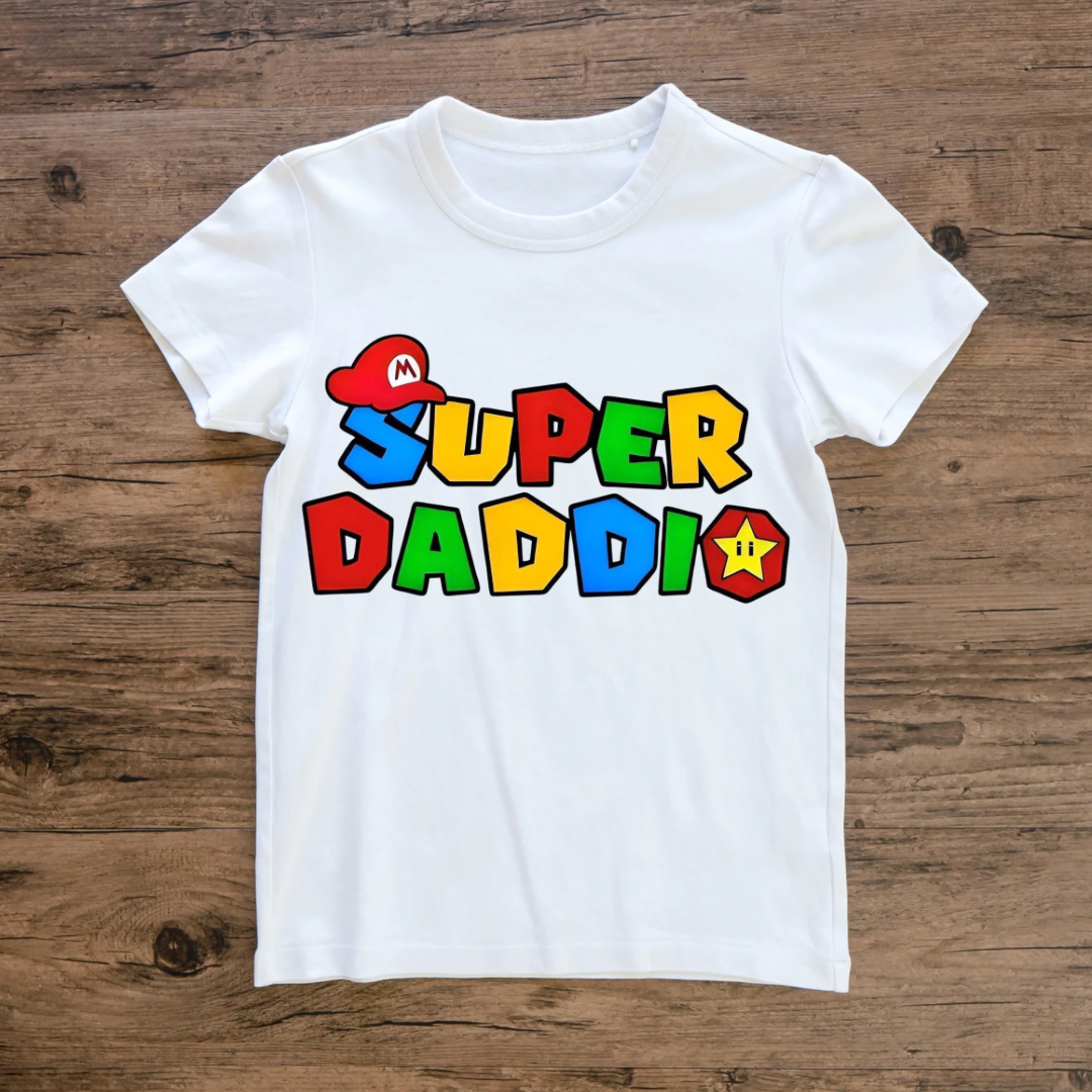 - Bold “Super Daddio” design with iconic Mario-style font